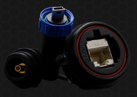 Our sealed RJ45 Ethernet connector solutions meet Cat 5e requirements for data rates up to 100Mhz and are suited to a wide variety of industrial & harsh environment applications.