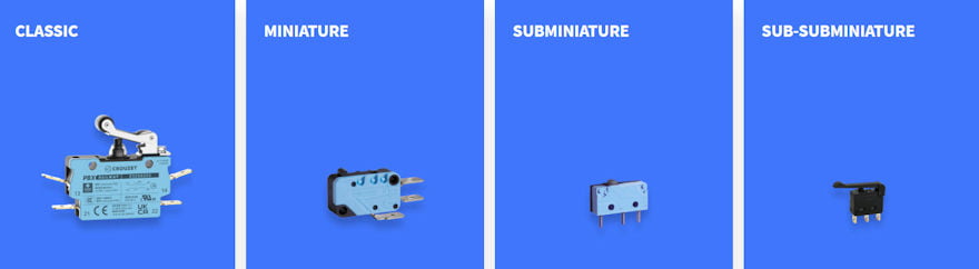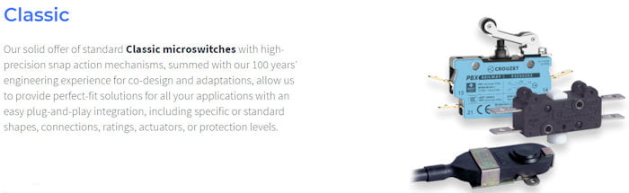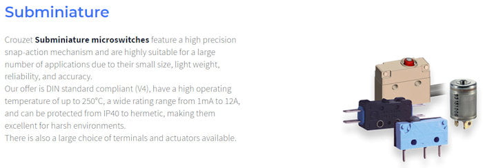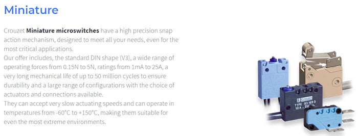 Crouzet offers an extensive choice of standard or customized Classic, Miniature, Subminiature and Sub-subminiature micros-witches, with a large range of switching ratings from 1 mA to 25 A, magnetic blowout versions for High DC ratings, sealed models, positive break versions, a wide range of operating temperatures, special models for explosive atmospheres, long service life and an enormous variety of actuators, contact materials and fixing means.