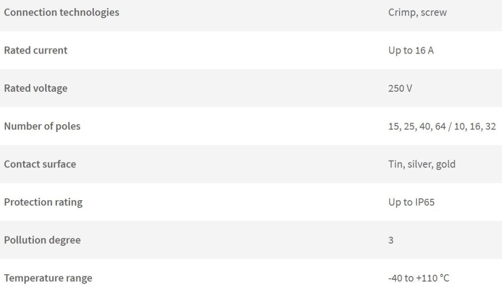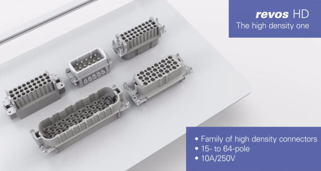 revos HD is the specialist for high-pole connections. The robust housings offer space for contact inserts with 15 to 64 poles and are designed for currents up to 10 A (as per DIN EN 17 5301-801). Alongside system engineering and machine building, revos HD also demonstrates its strengths in escalators, small motors, and injection molding machines.