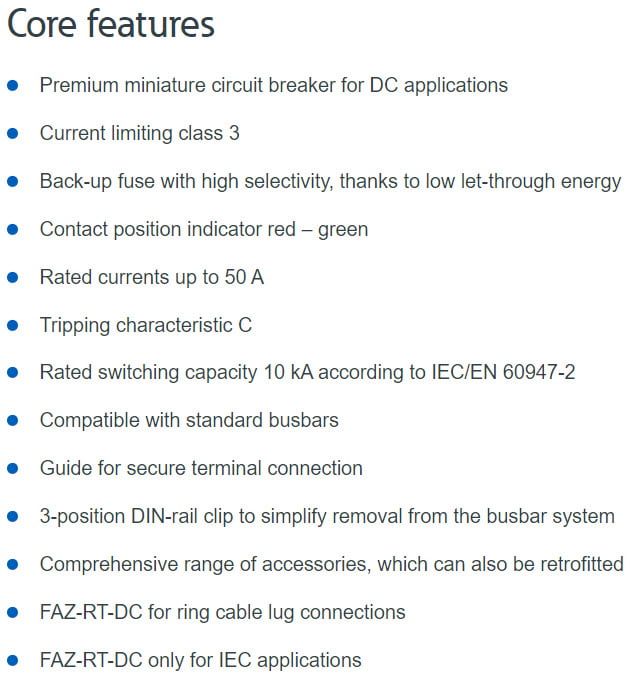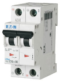 The FAZ-DC miniature circuit breaker is a protective device equipped with both a thermal and an electromagnetic release that is available in 1- and 2-pole versions. The FAZ is available with rated currents of 2 A to 50 A.