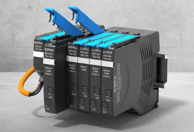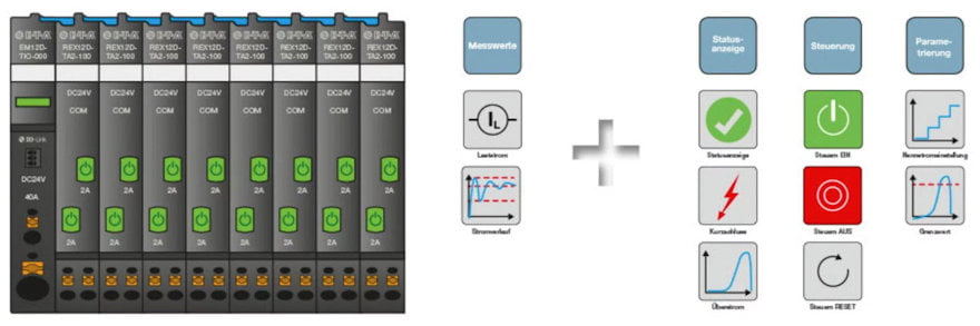 The REX12D intelligent system is ideally adapted to the requirements of machine construction and process control. The compact and modular design, the innovative connection technology and the great number of different devices provide a competitive edge over standard solutions to protect your DC 24 V power distribution.