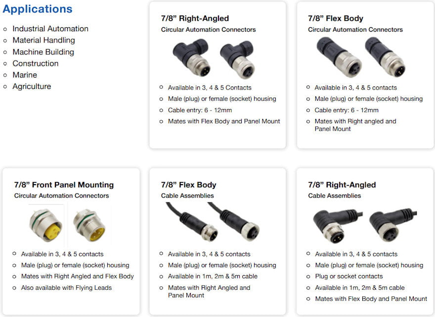 The 7/8" Series Circular Automation Connectors provide rugged and field-proven performance. Available as Flex Body or Right-Angled variants, they are provided with or without cable. Either as a Field-Terminated variant with a screw terminal connection or as overmoulded connectors with predetermined cable.