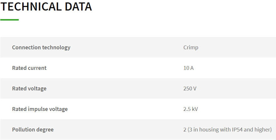 Connection is made with high-quality turned crimp contacts and offers a connection range from 0.14 to 2.5 mm² at a rated voltage of 250 V.without compromising the number of electrical connections.