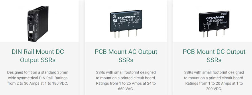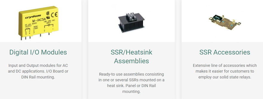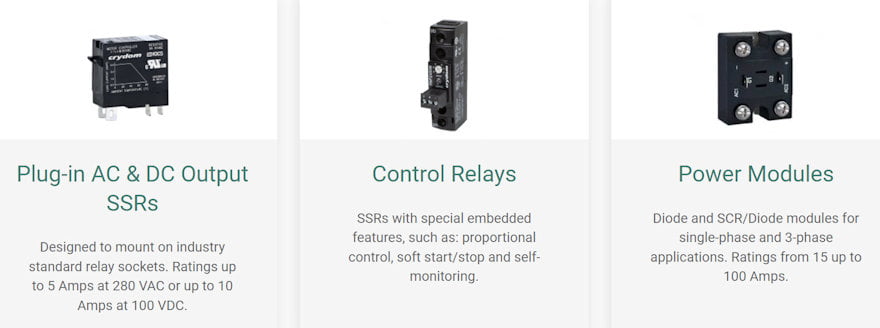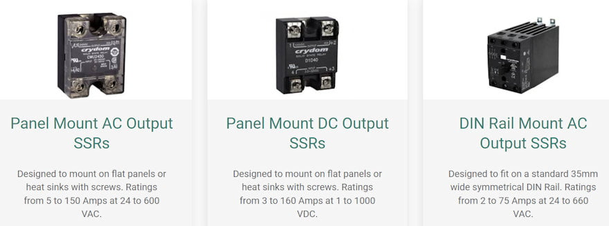 Sensata | Crydom has a broad offer of Solid State Relays and Contactors in several different mounting styles, covering a wide range of voltage and current ratings. Our Solid State Relays can be used to control almost any type of load in demanding heating, lighting, motion and power control applications that can benefit from the many advantages that SSRs have over traditional electromechanical relays, such as extended life expectancy, faster switching speed, lack of acoustical noise, higher resistance to shock and vibration, among others.